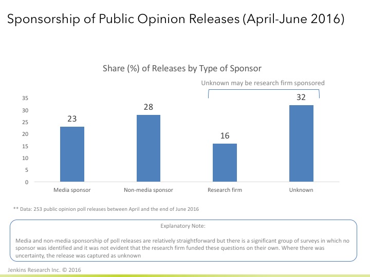 If 30 of the 82 unknown sponsor polls are political polling, this still leaves 52 for which the public is not sure who paid for the research. As a percentage of all poll releases, this means that 21% did not have an explicit sponsor and were not about political polling or government performance. It may be that some of these were funded by the research firm itself but this is unknown.