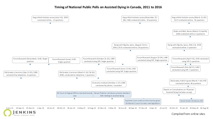 Assisted dying is a well polled issue in 2016; 6 polls have been released in 2016 in addition to the report from the External Panel on Options for a Legislative Response to Carter v. Canada, which included public consultation results. In fact, since 2011 there have been 17 public opinion releases on the topic of assisted dying and 5 of these have been sponsored by groups that are clearly positioned on the debate. Other releases may have been sponsored but the publicly available information is limited.
