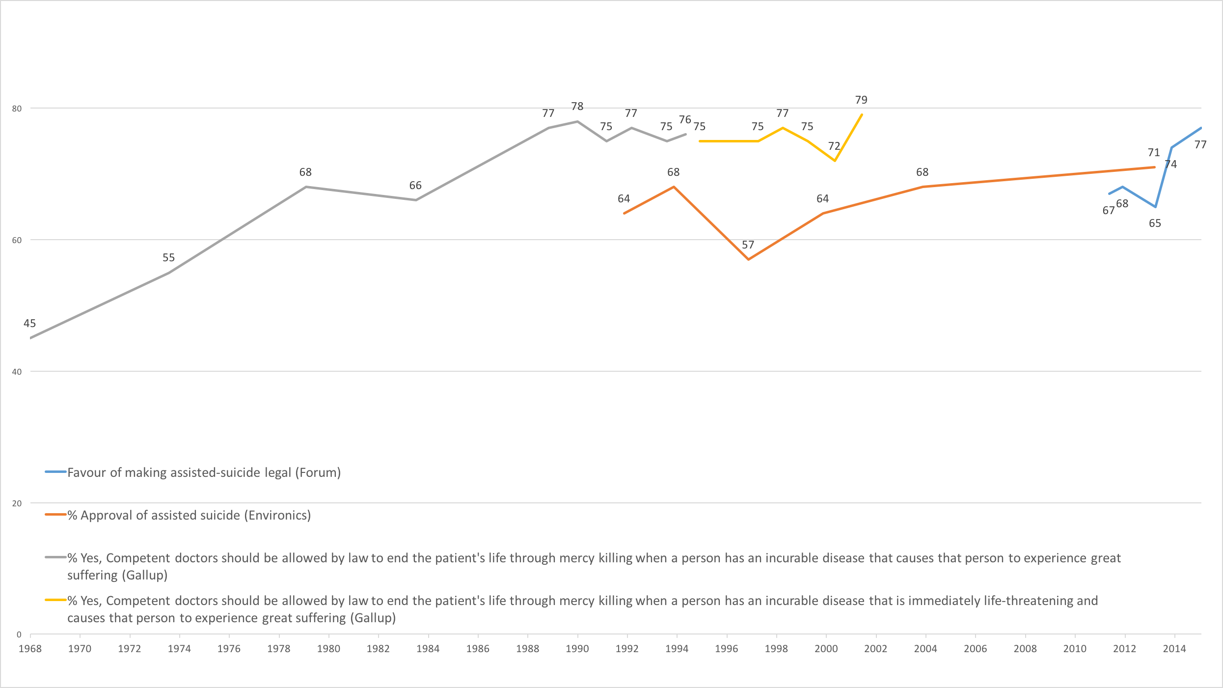 Assisted dying, which was called other things at the time, has been the subject of relatively few Canadian public opinion polls but the overall trend is one of a dramatic increase in support through the 70s and early 80s after which polls continued to show a majority in favour of allowing it.
