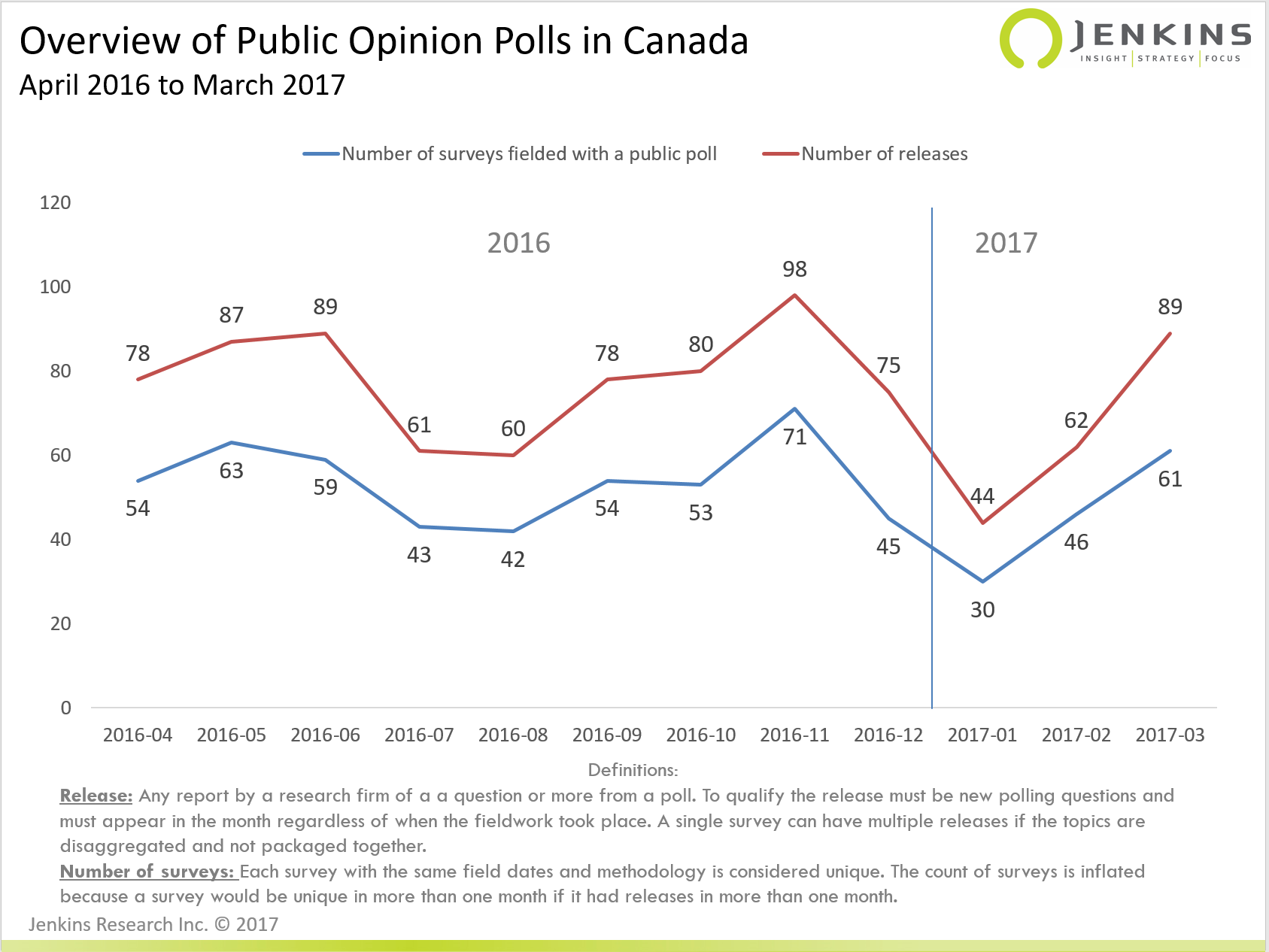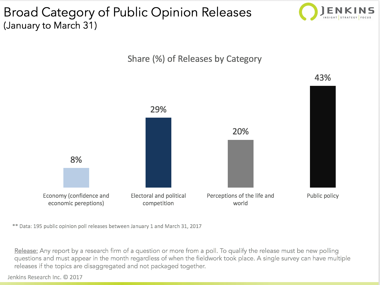 Consistent with the 2016 results, the primary category of public opinion releases is Public policy. Public policy represents 43% of the releases in Q1 with electoral and political competition the next most frequent. There is naturally some overlap, but if the release was primarily about the political consequences (e.g. on ballot) of policy directions, the release was coded as being about electoral and political competition.