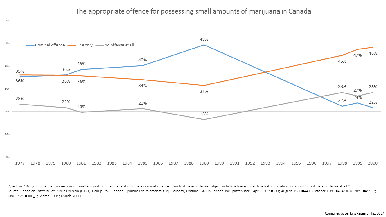 • Through the 1980s more Canadians came to the view that possession should be a criminal offence but by the late 90s, only one in five held onto this position. In its place, the support for a fine similar to a traffic violation was the plurality view.