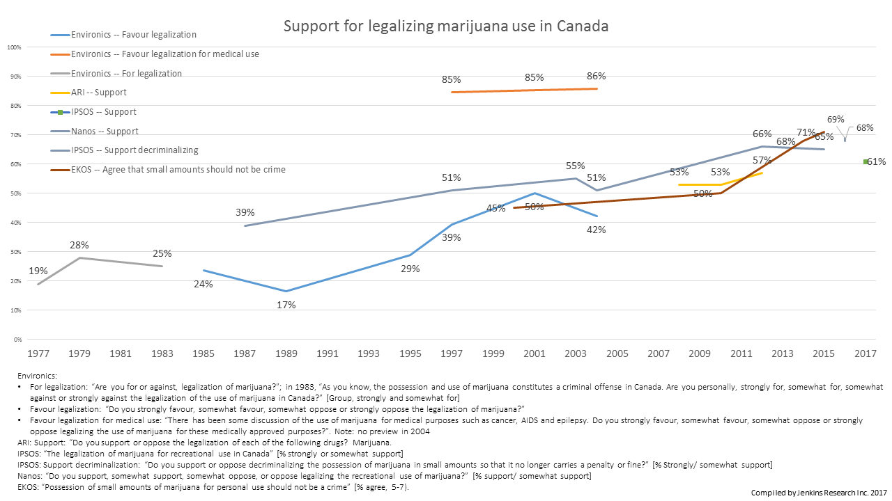 In the late 1970s, around one quarter of Canadians when asked a dichotomous question chose legalization. Since the 1970s, the trends in questions asked across time reveal a pattern of increasing support for liberalization of laws surrounding marijuana use. By 2003, 55% either somewhat or strongly supported decriminalizing the possession of marijuana in small amounts in an IPSOS survey and support has largely increased since that time.